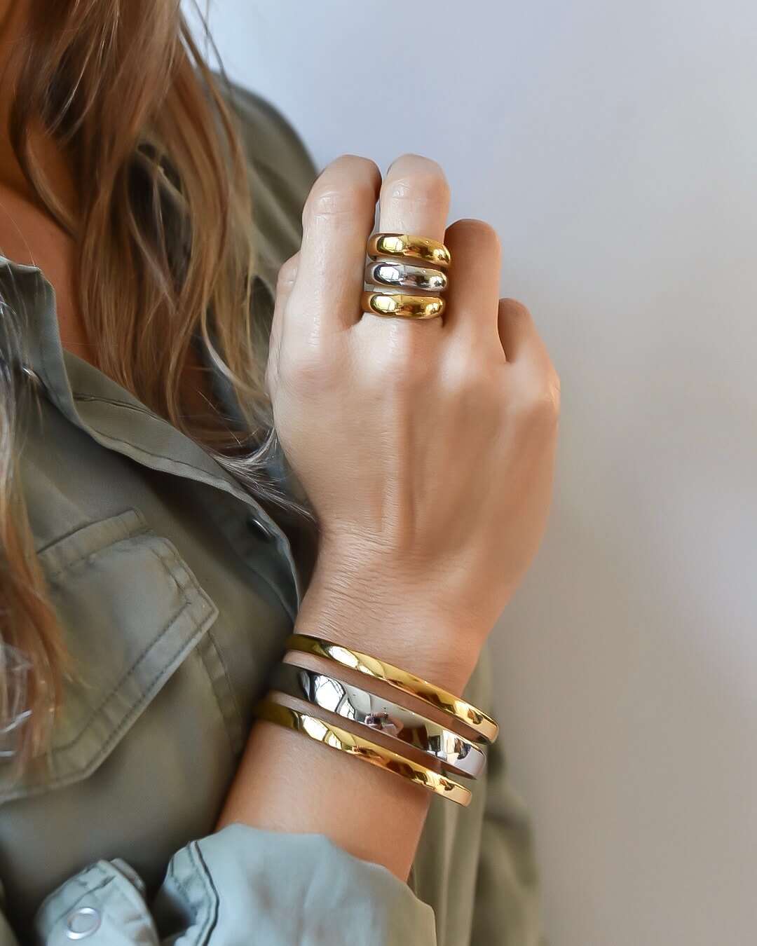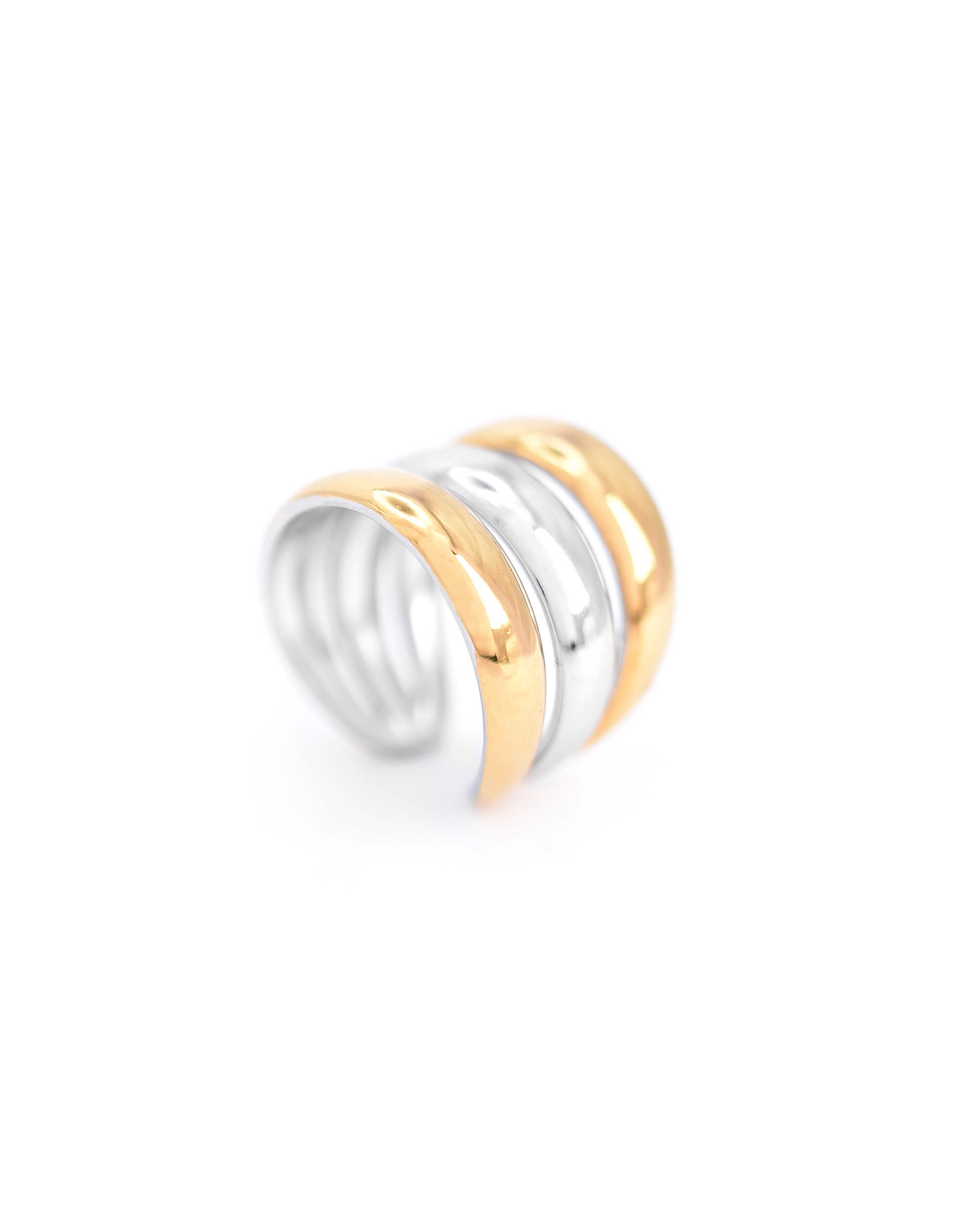 Nos encanta este anillo de acero inoxidable, con ese mix plateado y dorado, super en tendencia. Se adapta de talla 7 a 8.5