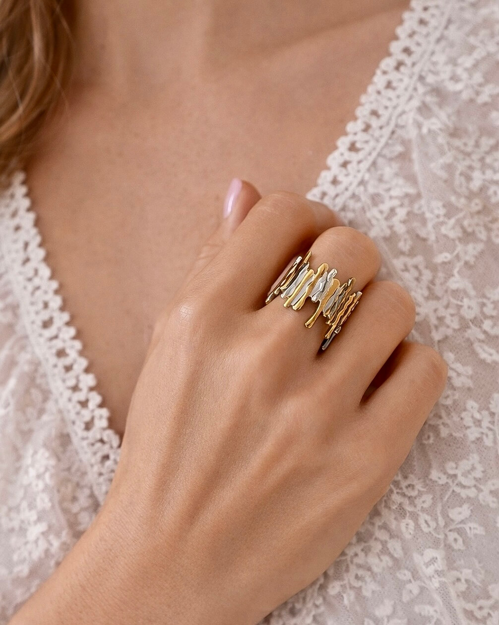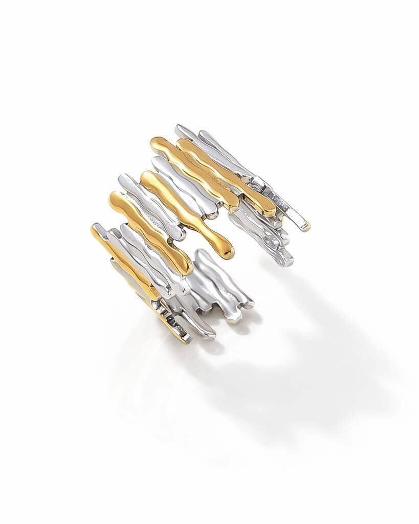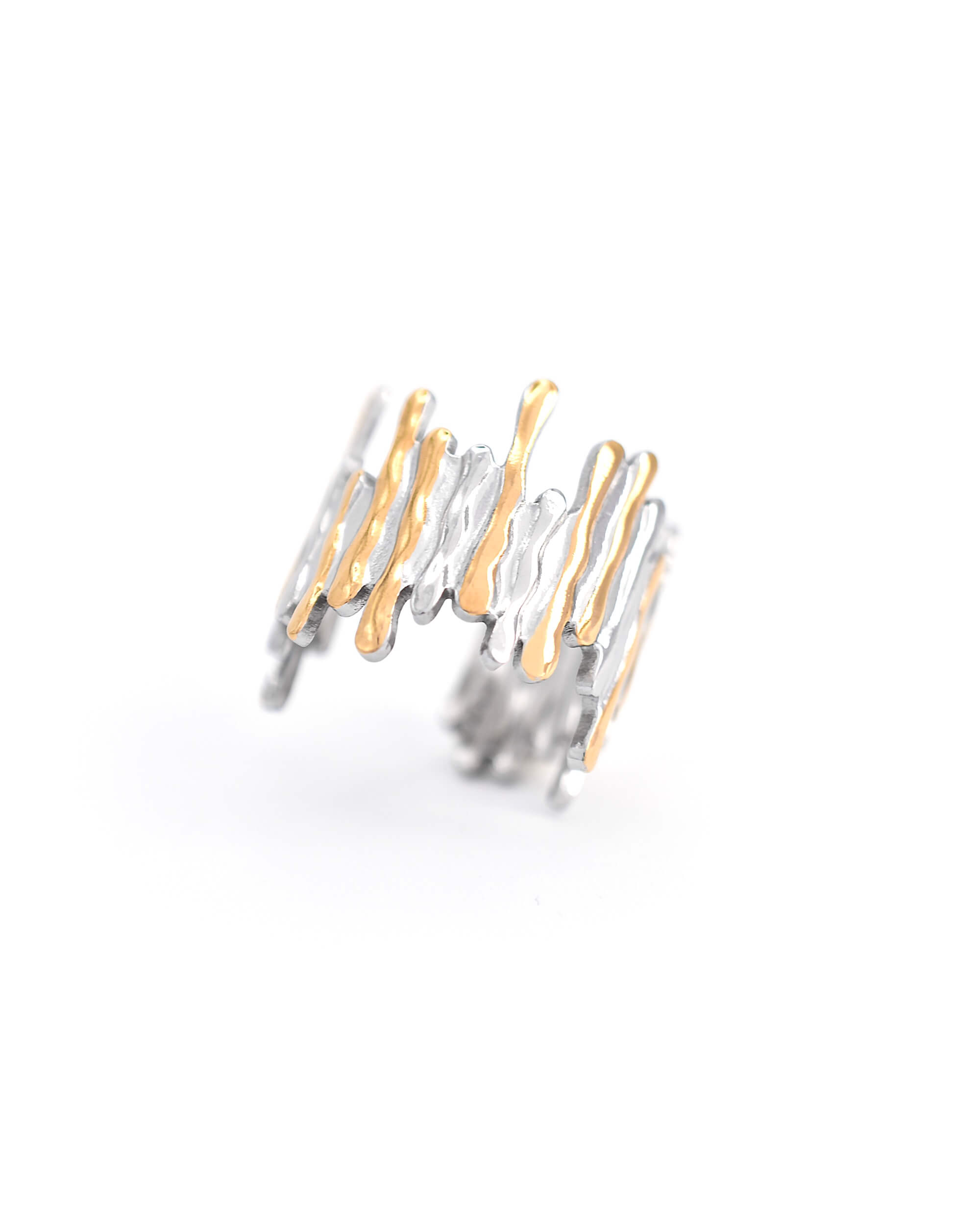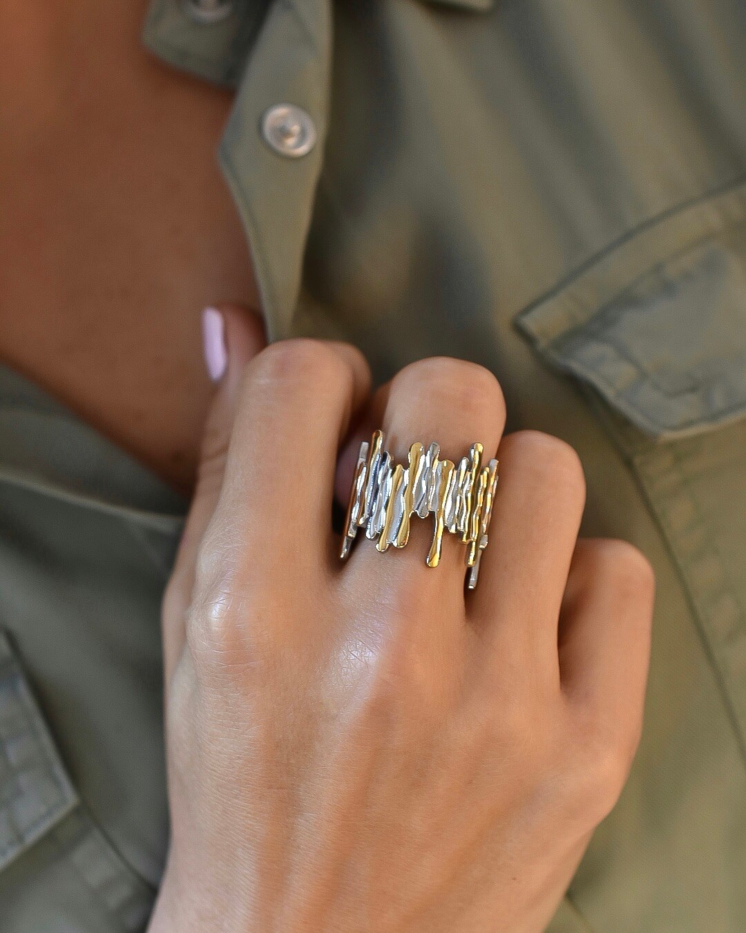 Espectacular diseño y combinación de color, Plateado y dorado, en tendencia!!! De acero inoxidable y nos encanta porque se ajusta a tu tamaño. Desde talla 5.5 hasta 8.5 tu lo abres y cierras a tu gusto. Lo puedes usar en cualquier dedo, es versátil