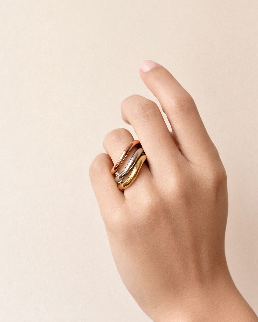 Un set fuera de serie, tan original como tú. Incluye los 3 tonos (1 dorado, 1 plateado y 1 oro rosa) Combinar jamás será un problema. De acero inoxidable con garantía cero corrosión. Sí así es, puedes llevarlos hasta al mar.