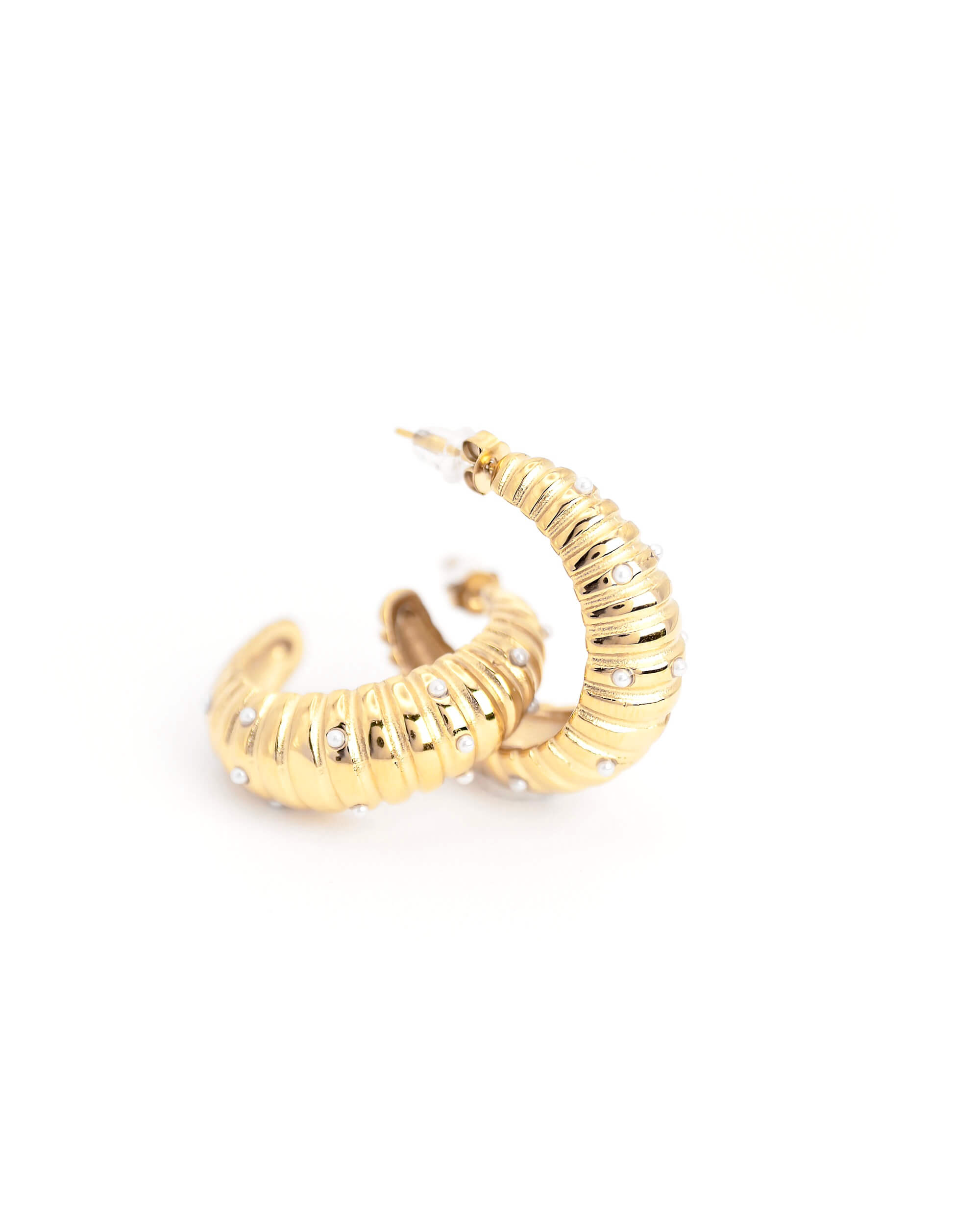 Argollas media luna de acero inoxidable grado quirugico con unas mini perlitas y un texturizado que hace la diferencia. Tú debes lucir diseños diferentes porque eres única.
