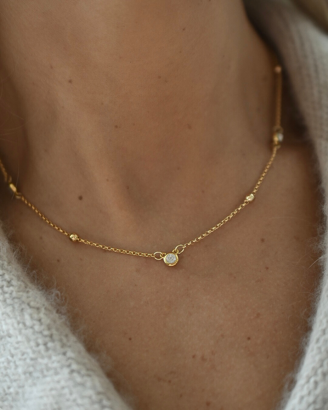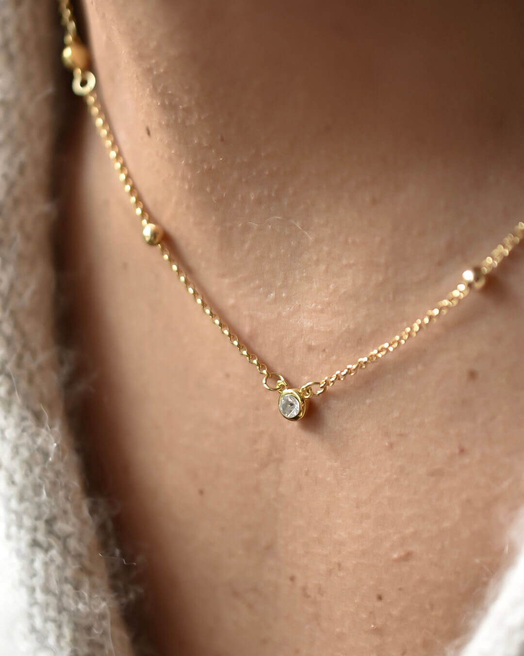 Delicado collar de acero inoxidable con baño de oro y zirconias, su textura y bolitas intercaladas le da un toque unico, diseño delicado y atemporal, es un básico para tu look.