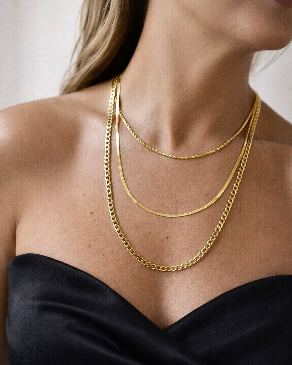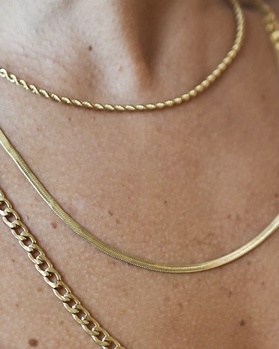 Agrega este layer a tu look y llénate de estilo, Un solo collar de 3 cadenas, su combinación de texturas y eslabones lo hace unico. Completamente de acero inoxidable.