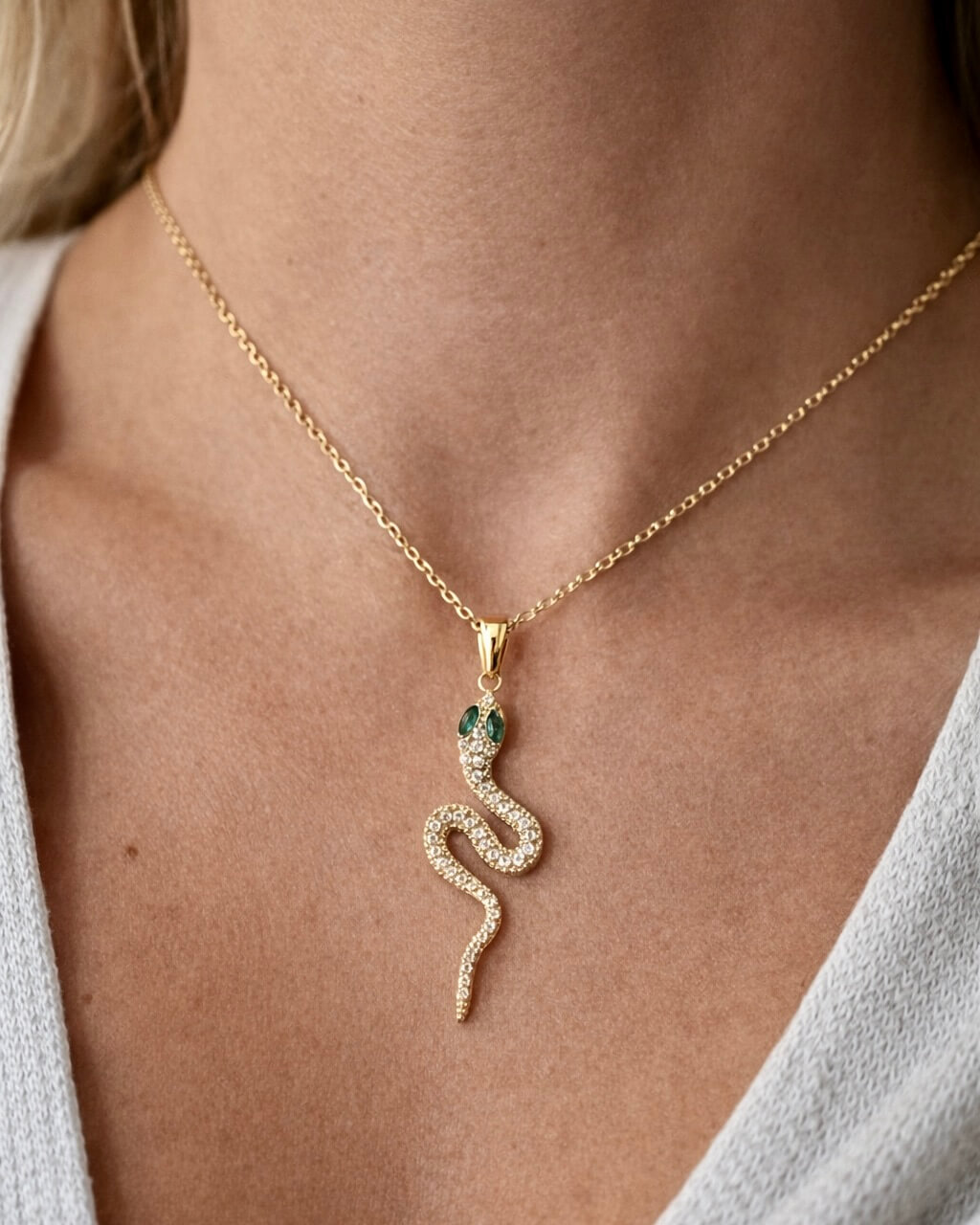 Collar Serpenti, diseño de colección de marca internacional. Sus detalles, destellos y elegancia da el toque perfecto a un look elegante y super chic. De acero inoxidable con un delicado baño de oro . Con garantía de cero corrosión. Zirconias transparentes y esmeraldas.