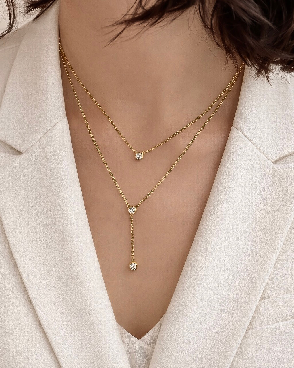 Delicado collar doble cadena con zirconias, un detalle lleno de brillo. Completamente de acero inoxidable con garantia.
