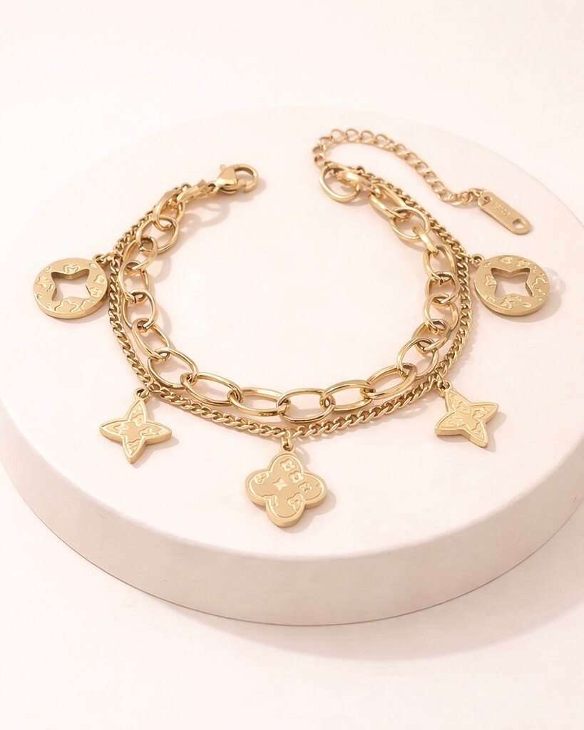 FUERA DE SERIE, pulsera doble cadena de acero inoxidable con charms (grabados de marca) llena tu look de estilo