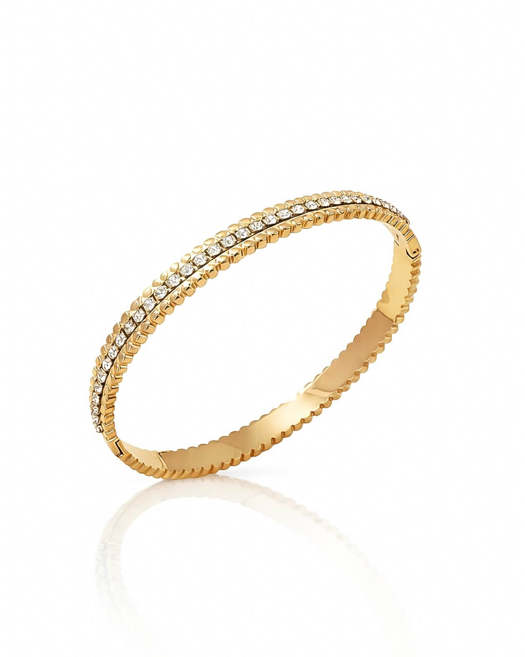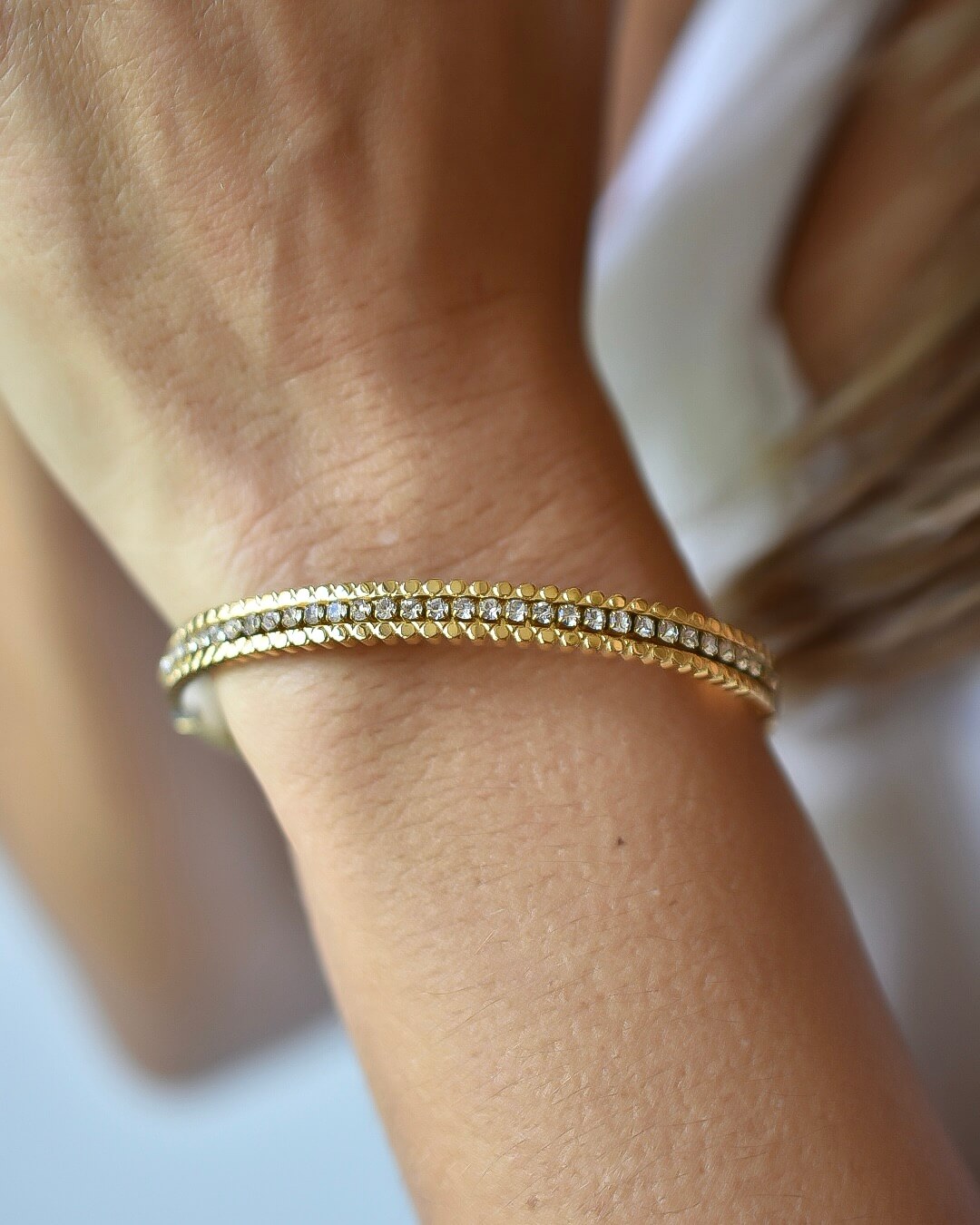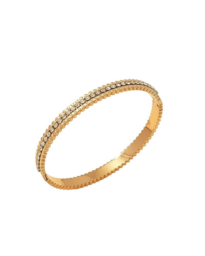 Delicada Pulsera de acero inoxidable grado quirúrgico con un delicado baño de oro y zirconias incrustadas , cuenta con garantía de cero corrosión, puedes lucirla sin preocupaciones que se oxide o se dañe.