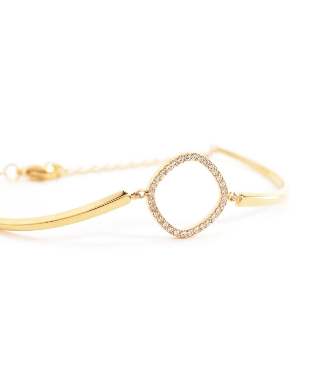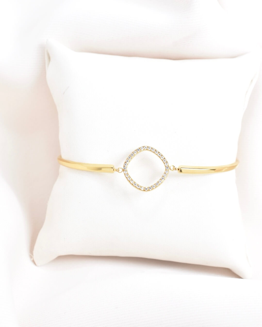 Un diseño tan delicado que ya es un Clásico, Sus destellos perfectos la hacen el detalle ideal para tu look. De acero inoxidable con un delicado baño de oro y en el centro zirconias micro pavé, delicadamente incrustadas.