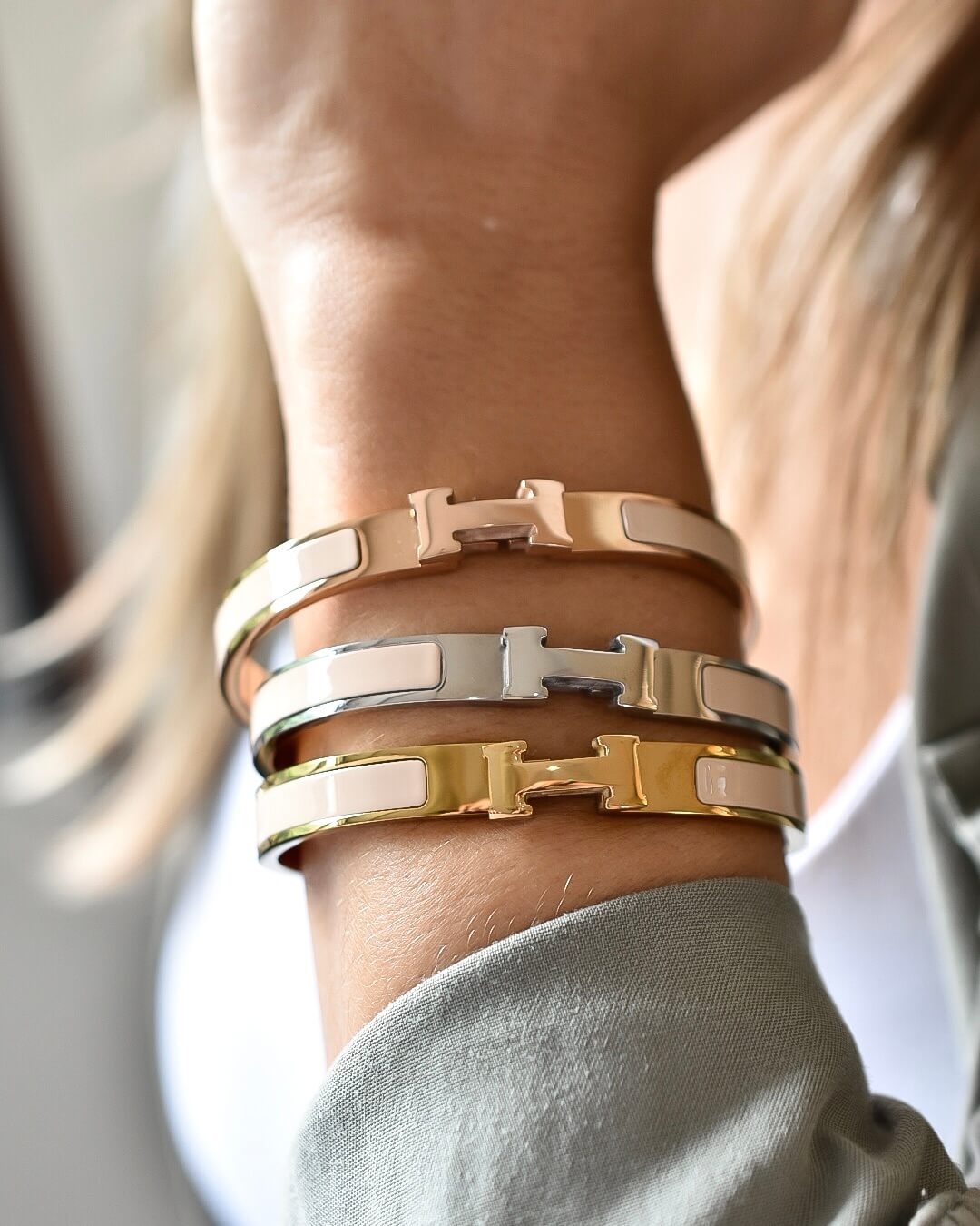 Espectacular diseño de colección de marca internacional con grabado de marca, Completamente de acero inoxidable con un enamel color nube que combina con todo a la perfección. Elegante, super chic y femenino. Se abre girando la H
