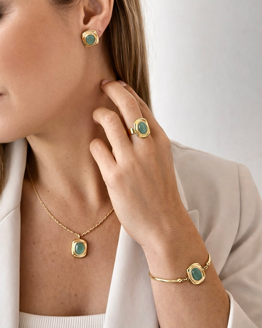 Un set que no necesita presentación, es simplemente fabuloso, diseño, mix de color y en el mejor material: acero inoxidable con piedras crisoberilo, en tono verde azulado (la luz hace su magia)