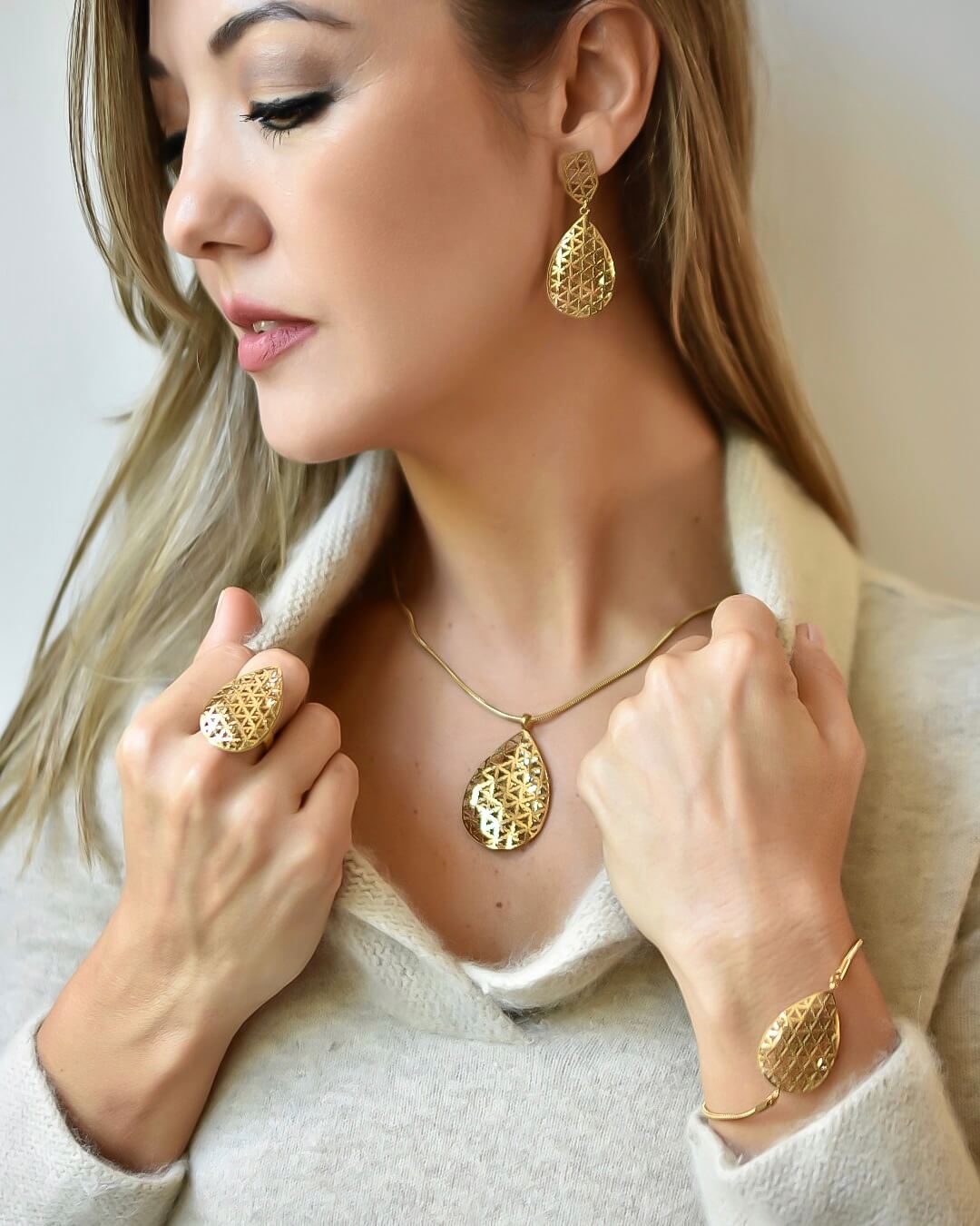 Estas lista para ser el centro de atención? este set increíblemente elegante de acero inoxidable incluye: Collar, Pulsera, Aretes y Anillo. Prepárate para brillar porque su textura crea destellos naturales. LO AMAMOS y sabemos que tu también lo harás.