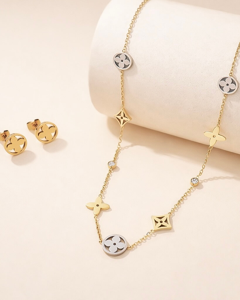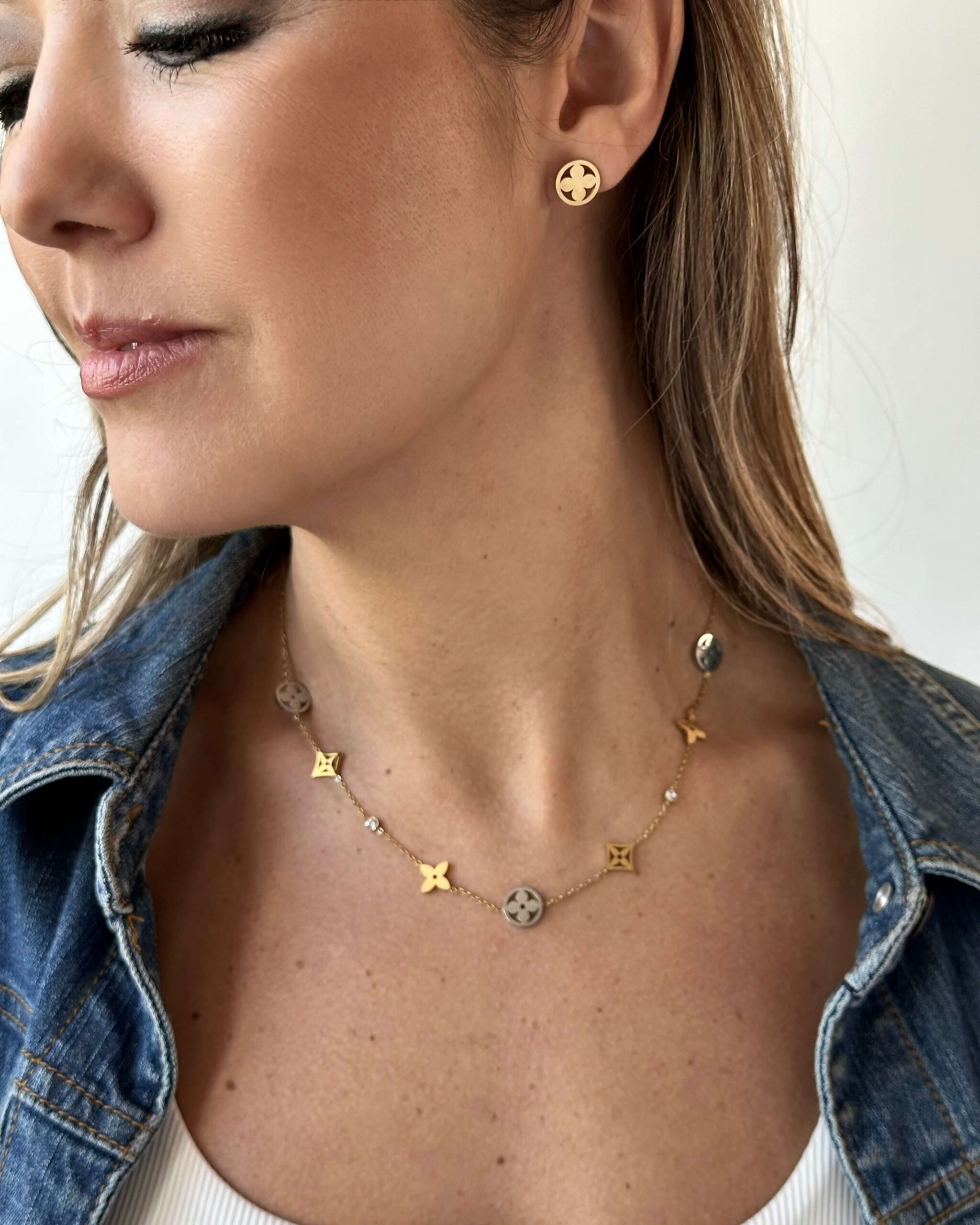 Medidas: Collar: 43 cms de largo + 5 cms adicionales Aretes: 1 cm