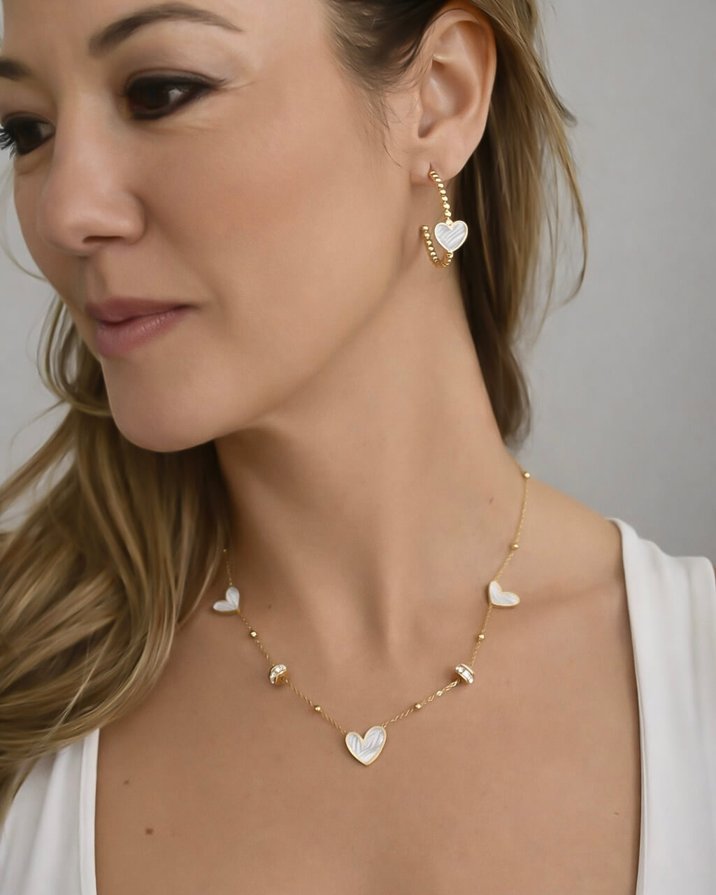 Delicado, lleno de brillo y estilo. Set de acero inoxidable con zirconias princess cut. Incluye collar y aretes.