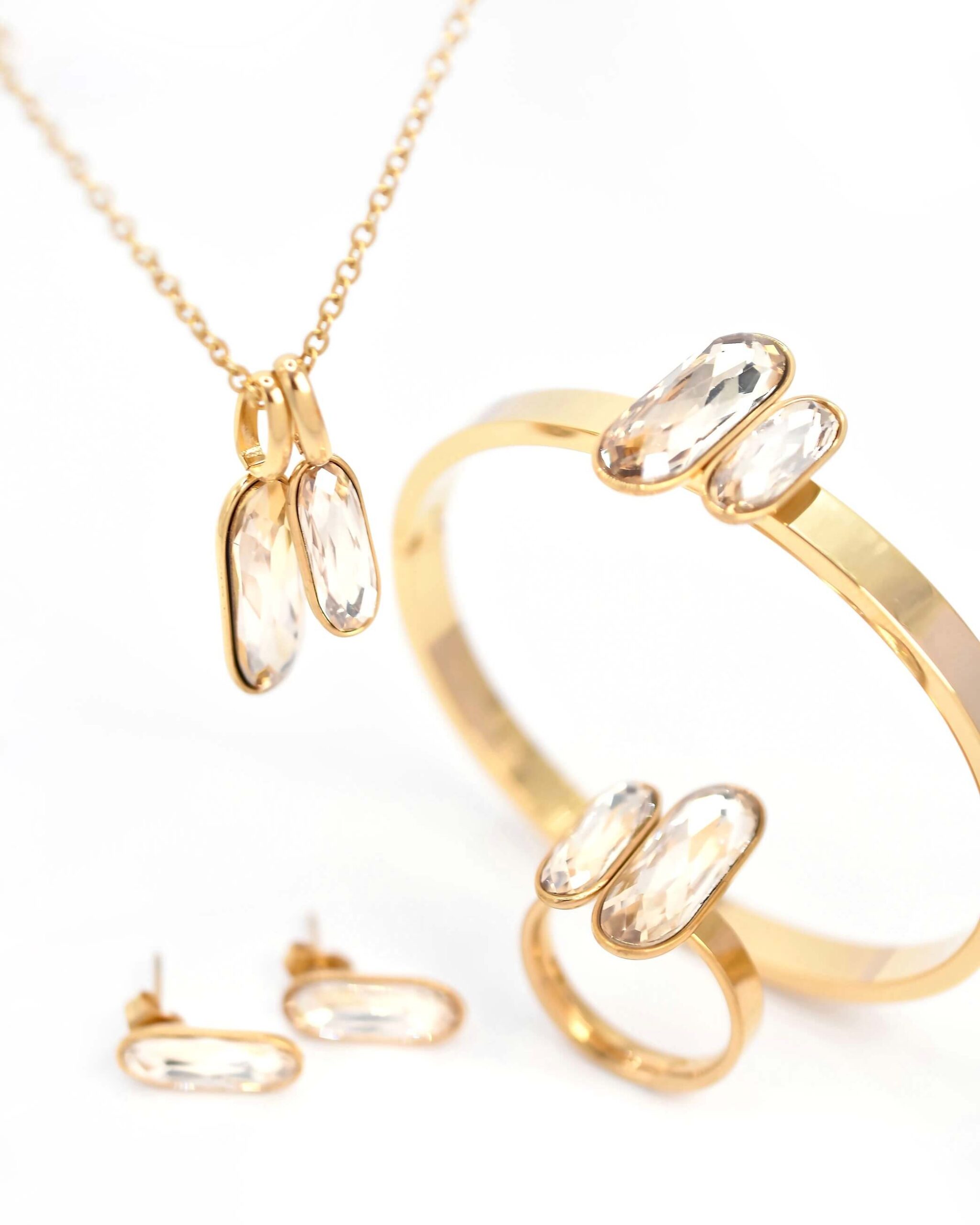 Llena tu look con brillo y estilo, set completo de acero inoxidable con zirconias tono ambar.