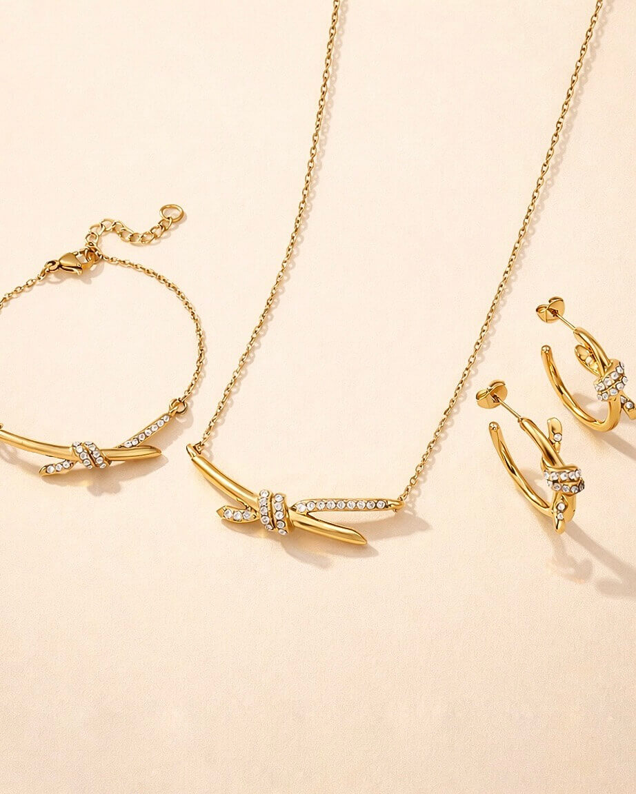 Un diseño de marca internacional que combina belleza, elegancia y brillo, este set exclusivo es un top. de acero inoxidable con zirconias.
